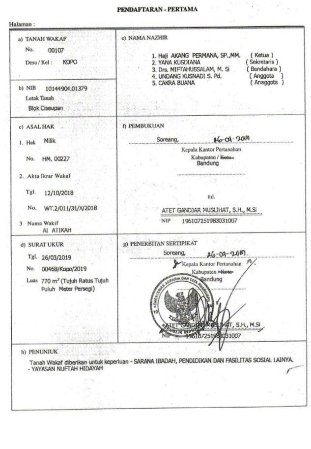 - Legalitas Pembangunan Masjid Nur Alif Di Kawasan Terpadu Stadion Si Jalak Harupat.Bandung, 10 Mei 2025 Masjid Nur Alif yang berlokasi di Kawasan terpadu Stadion Jalak Harupat dengan luas tanah 770 m2, merupakan tanah wakaf yang di wakafkan ke Yayasan Nuftah Hidayah dari Keluarga BesarLanjutkan membaca “Legalitas Pembangunan Masjid Nur Alif Di Kawasan Terpadu Stadion Si Jalak Harupat.”