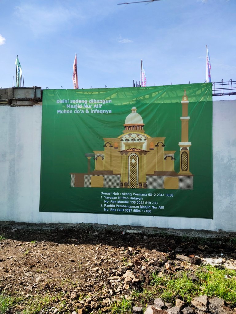 Dan untuk Donasi Pembangunan Masjid Nur Alif yaitu : Bank Mandiri No.Rek. 1300022519733 an.Yayasan Nuftah Hidayah, Bank Jabar Banten No.Rek. 0097550417100, an. Panitia Pembangunan Masjid Nur Alif
