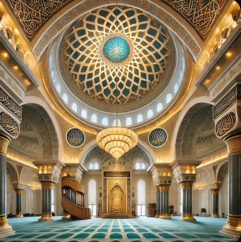 ✅ Kubah Interior: Kubah bagian dalam akan dihiasi dengan motif geometris dan kaligrafi Islami yang elegan, menggunakan kombinasi warna emas dan biru untuk kesan megah.