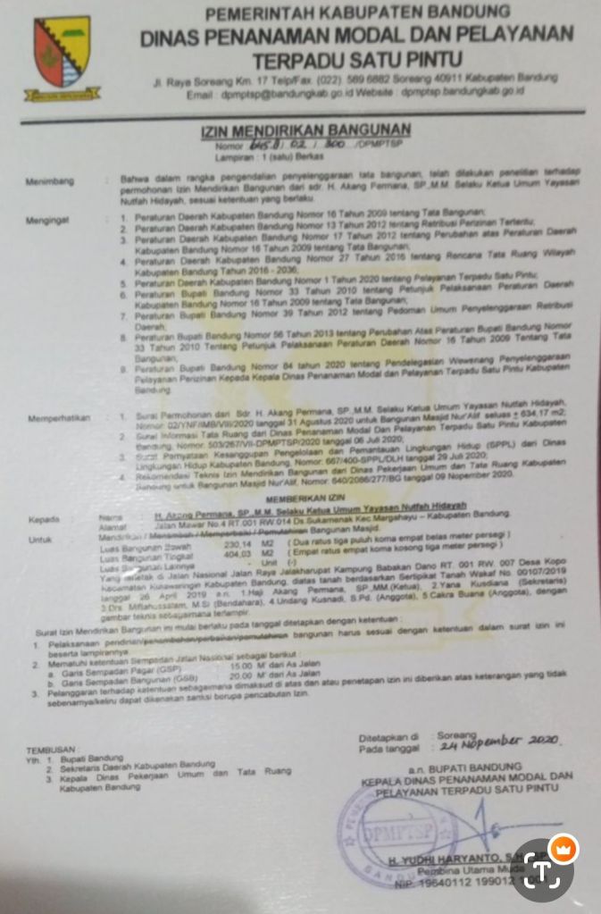 Pada Tahap awal Panitia Pembangunan telah memohon penerbitan Surat Ijin Mendirikan Bangunan Masjid Nur Alif, ke BPPT(Badan Pelayanan Perijinan Terpadu Kabupaten Bandung, dengan melampirkan berbagai persyaratan mulai dari NPWP, Akta Notaris Yayasan, Denah dan gambar ruang, serta Rekomendasi dari Dinas Lingkungan Hidup, sehingga terbitlah Surat Keterangan Izin Mendirikan Bangunan Dengan Nomor :