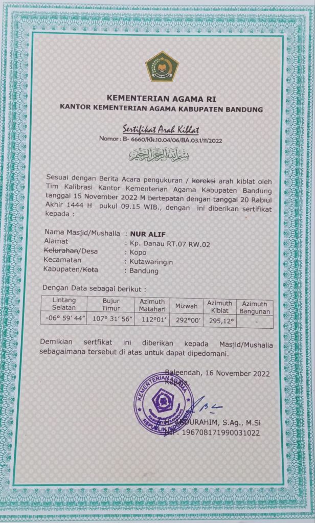 Selain mendapatkan Izin IMB Masjid Nur Alif telah mendapatkan Sertifikat Arah Kiblat dari Kanwil Departemen Agama, Kabupaten Bandung.